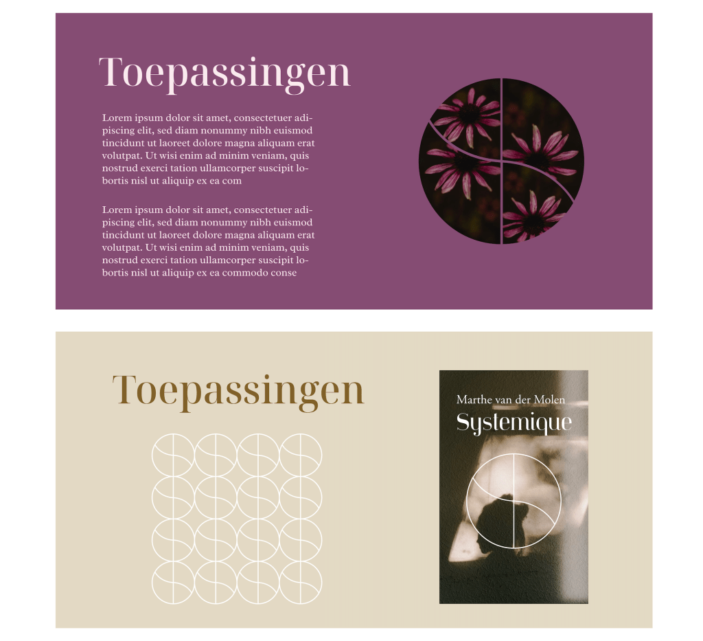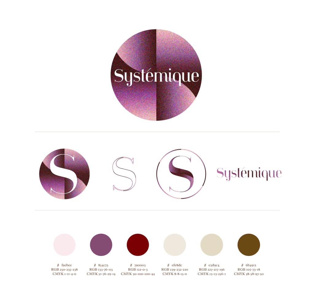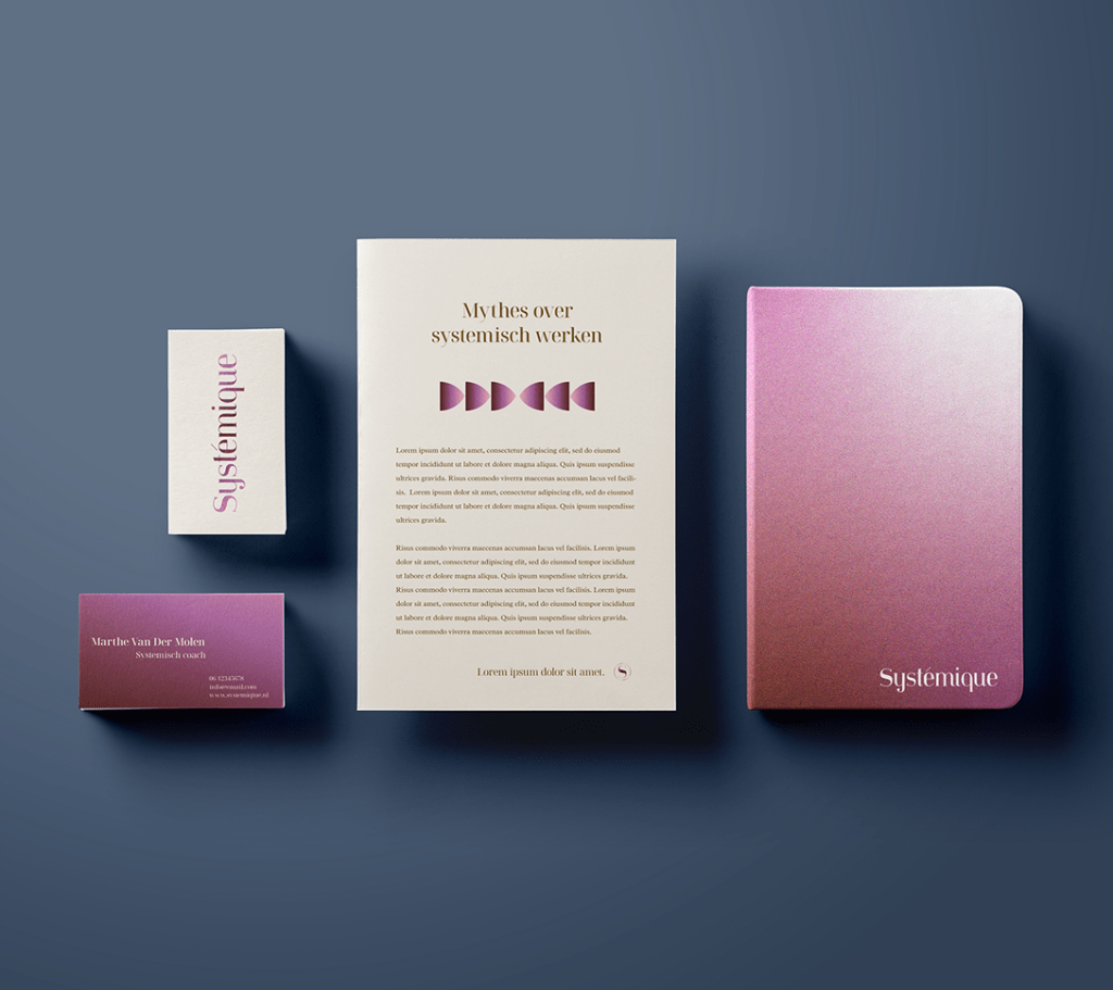 Logo, huisstijl en mini brandbook Systémique. Dit betreft een bedrijf dat zich specialiseert in systemisch coachen, waarbij gekeken wordt naar patronen, naar het geheel / het systeem en je eigen aandeel daarin.